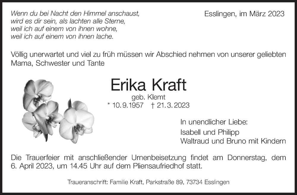 Hier finden Sie alle Traueranzeigen aus der Zeitung, die bisher für Erika Kraft erschienen sind. Weitere Traueranzeigen, die in der Zeitung erscheinen, werden hier ebenfalls aufgelistet