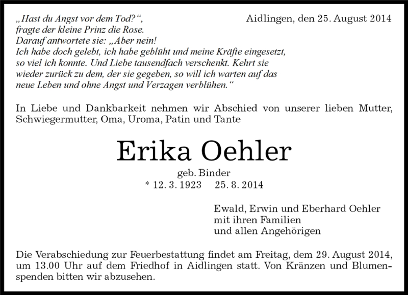 Hier finden Sie alle Traueranzeigen aus der Zeitung, die bisher für Erika Oehler erschienen sind. Weitere Traueranzeigen, die in der Zeitung erscheinen, werden hier ebenfalls aufgelistet