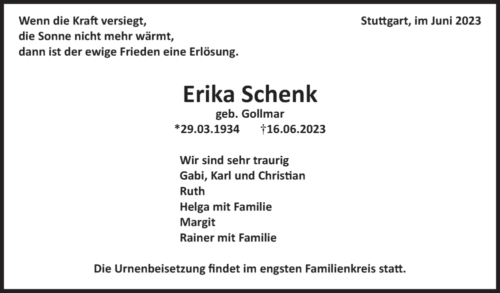 Hier finden Sie alle Traueranzeigen aus der Zeitung, die bisher für Erika Schenk erschienen sind. Weitere Traueranzeigen, die in der Zeitung erscheinen, werden hier ebenfalls aufgelistet