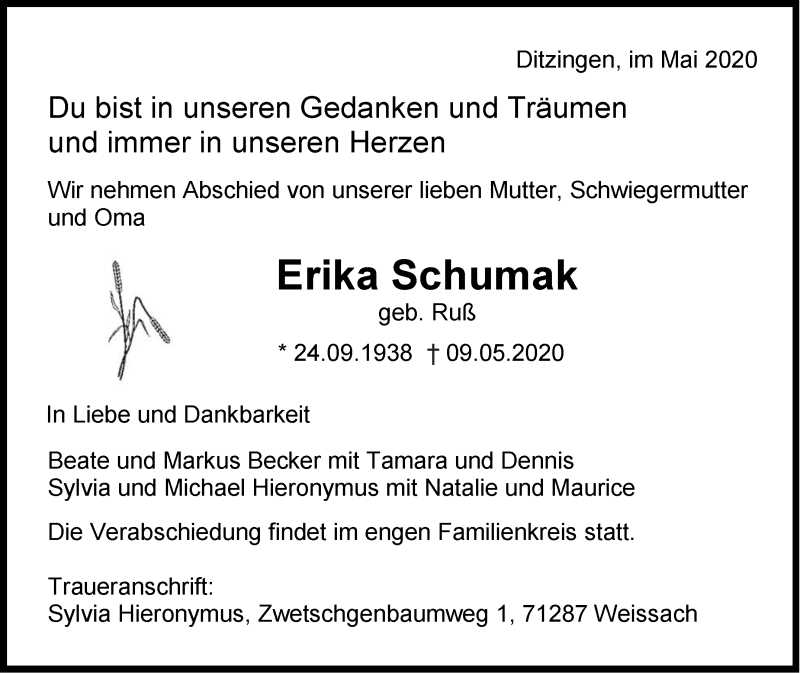 Hier finden Sie alle Traueranzeigen aus der Zeitung, die bisher für Erika Schumak erschienen sind. Weitere Traueranzeigen, die in der Zeitung erscheinen, werden hier ebenfalls aufgelistet
