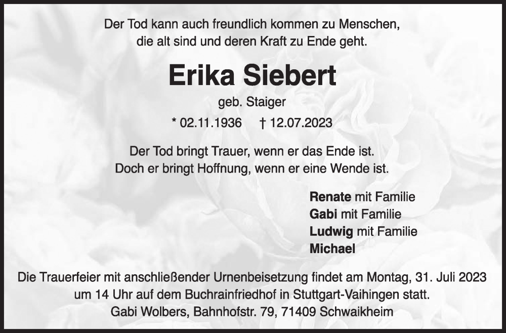 Hier finden Sie alle Traueranzeigen aus der Zeitung, die bisher für Erika Siebert erschienen sind. Weitere Traueranzeigen, die in der Zeitung erscheinen, werden hier ebenfalls aufgelistet