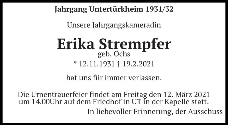 Hier finden Sie alle Traueranzeigen aus der Zeitung, die bisher für Erika Strempfer erschienen sind. Weitere Traueranzeigen, die in der Zeitung erscheinen, werden hier ebenfalls aufgelistet