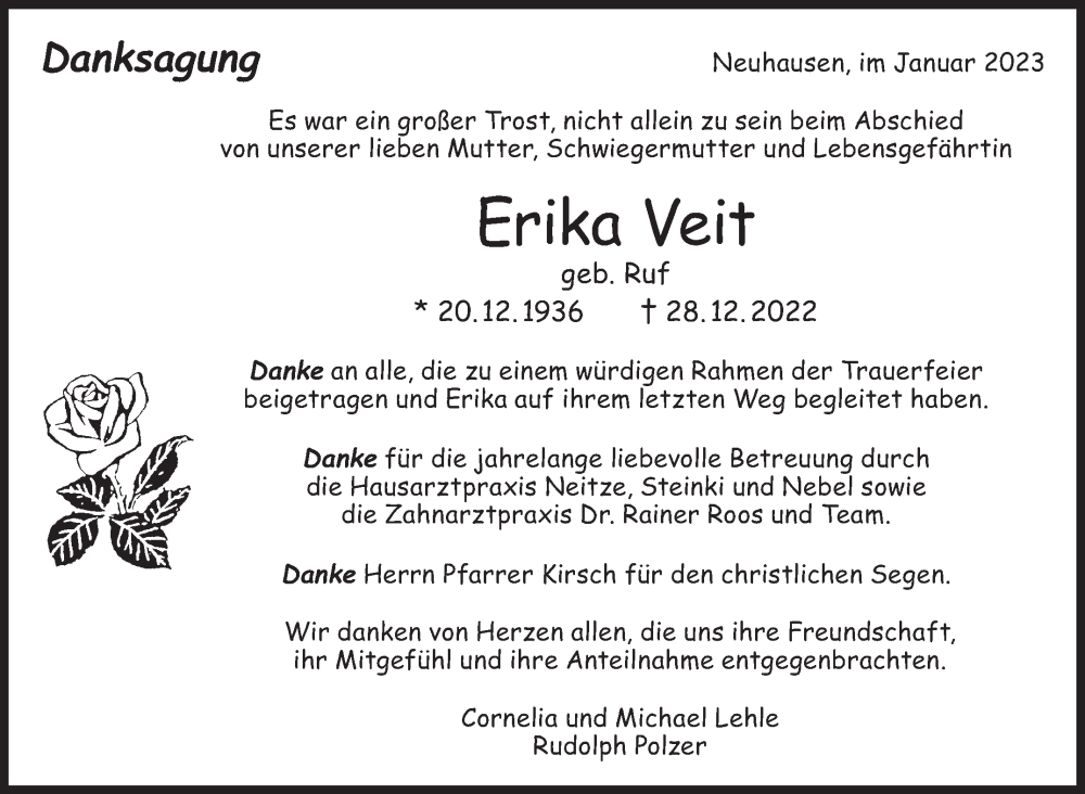 Hier finden Sie alle Traueranzeigen aus der Zeitung, die bisher für Erika Veit erschienen sind. Weitere Traueranzeigen, die in der Zeitung erscheinen, werden hier ebenfalls aufgelistet