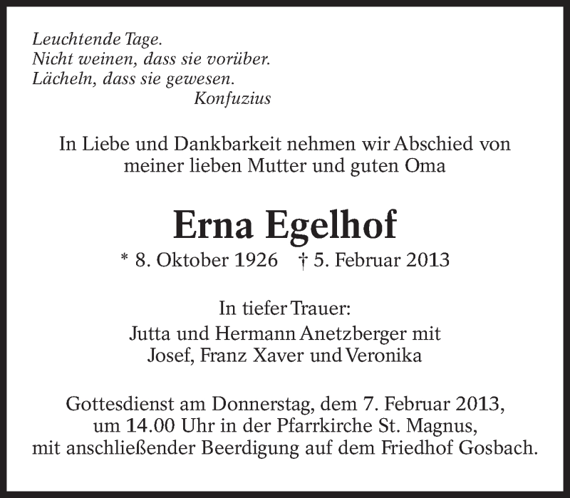 Hier finden Sie alle Traueranzeigen aus der Zeitung, die bisher für Erna Egelhof erschienen sind. Weitere Traueranzeigen, die in der Zeitung erscheinen, werden hier ebenfalls aufgelistet