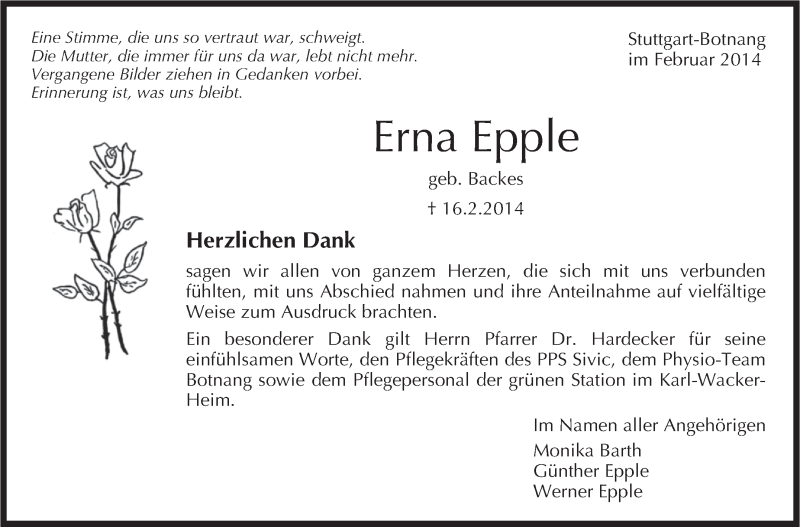 Hier finden Sie alle Traueranzeigen aus der Zeitung, die bisher für Erna Epple erschienen sind. Weitere Traueranzeigen, die in der Zeitung erscheinen, werden hier ebenfalls aufgelistet