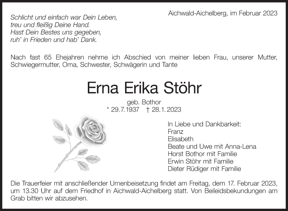 Hier finden Sie alle Traueranzeigen aus der Zeitung, die bisher für Erna Erika Stöhr erschienen sind. Weitere Traueranzeigen, die in der Zeitung erscheinen, werden hier ebenfalls aufgelistet
