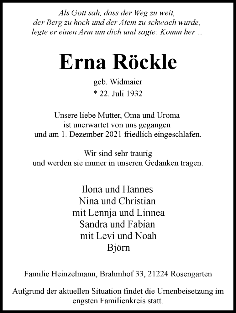 Hier finden Sie alle Traueranzeigen aus der Zeitung, die bisher für Erna Röckle erschienen sind. Weitere Traueranzeigen, die in der Zeitung erscheinen, werden hier ebenfalls aufgelistet