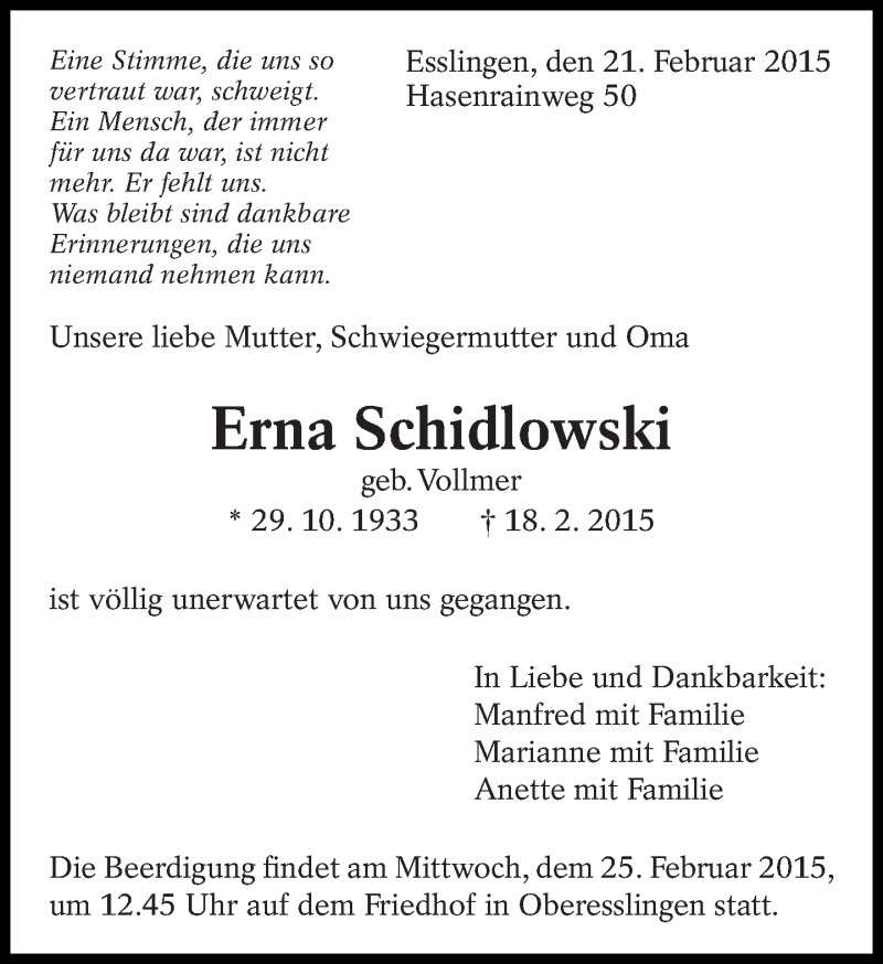 Hier finden Sie alle Traueranzeigen aus der Zeitung, die bisher für Erna Schidlowski erschienen sind. Weitere Traueranzeigen, die in der Zeitung erscheinen, werden hier ebenfalls aufgelistet