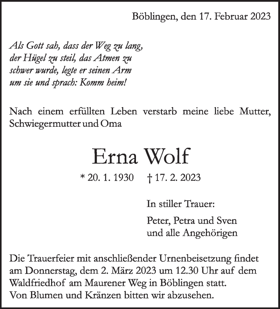 Hier finden Sie alle Traueranzeigen aus der Zeitung, die bisher für Erna Wolf erschienen sind. Weitere Traueranzeigen, die in der Zeitung erscheinen, werden hier ebenfalls aufgelistet