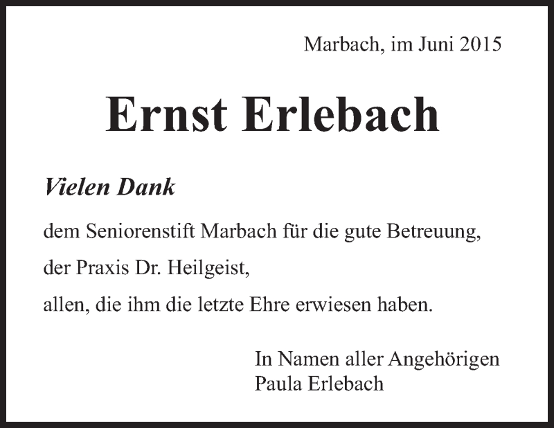 Hier finden Sie alle Traueranzeigen aus der Zeitung, die bisher für Ernst Erlebach erschienen sind. Weitere Traueranzeigen, die in der Zeitung erscheinen, werden hier ebenfalls aufgelistet