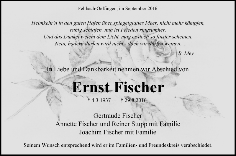 Hier finden Sie alle Traueranzeigen aus der Zeitung, die bisher für Ernst Fischer erschienen sind. Weitere Traueranzeigen, die in der Zeitung erscheinen, werden hier ebenfalls aufgelistet