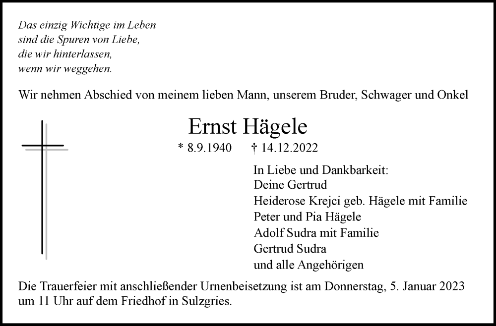 Hier finden Sie alle Traueranzeigen aus der Zeitung, die bisher für Ernst Hägele erschienen sind. Weitere Traueranzeigen, die in der Zeitung erscheinen, werden hier ebenfalls aufgelistet