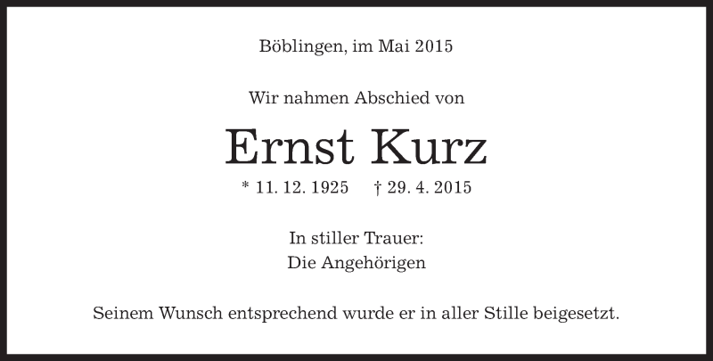 Hier finden Sie alle Traueranzeigen aus der Zeitung, die bisher für Ernst Kurz erschienen sind. Weitere Traueranzeigen, die in der Zeitung erscheinen, werden hier ebenfalls aufgelistet