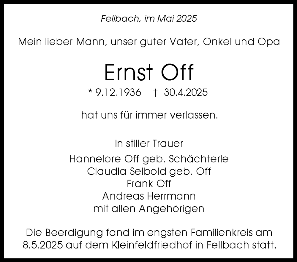 Hier finden Sie alle Traueranzeigen aus der Zeitung, die bisher für Ernst Off erschienen sind. Weitere Traueranzeigen, die in der Zeitung erscheinen, werden hier ebenfalls aufgelistet