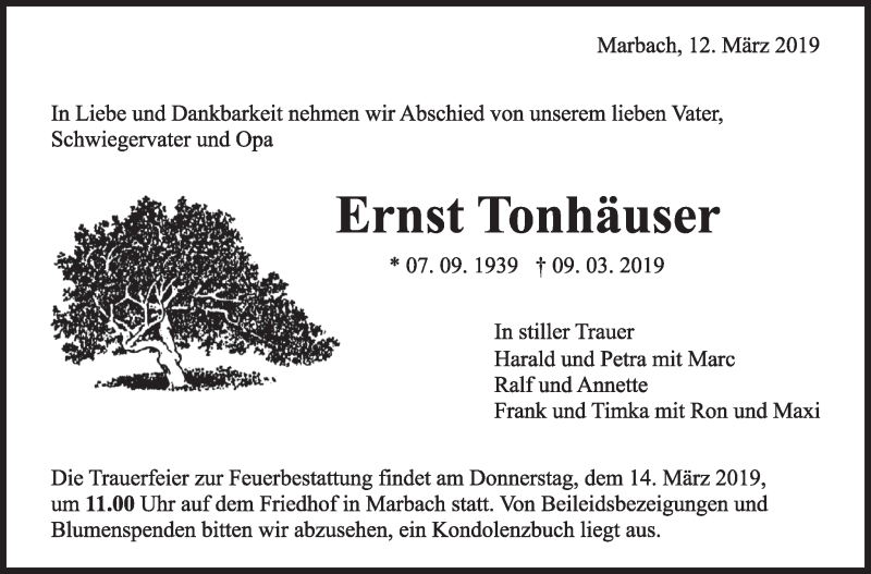 Hier finden Sie alle Traueranzeigen aus der Zeitung, die bisher für Ernst Tonhäuser erschienen sind. Weitere Traueranzeigen, die in der Zeitung erscheinen, werden hier ebenfalls aufgelistet