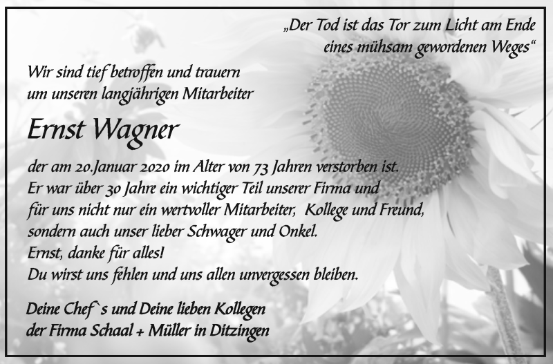 Hier finden Sie alle Traueranzeigen aus der Zeitung, die bisher für Ernst Wagner erschienen sind. Weitere Traueranzeigen, die in der Zeitung erscheinen, werden hier ebenfalls aufgelistet