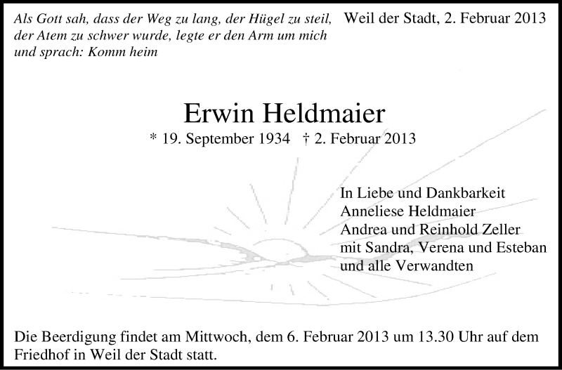 Hier finden Sie alle Traueranzeigen aus der Zeitung, die bisher für Erwin Heldmaier erschienen sind. Weitere Traueranzeigen, die in der Zeitung erscheinen, werden hier ebenfalls aufgelistet