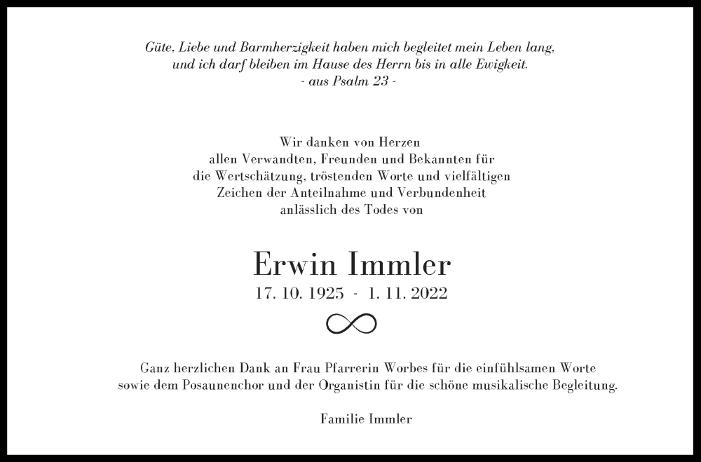 Hier finden Sie alle Traueranzeigen aus der Zeitung, die bisher für Erwin Immler erschienen sind. Weitere Traueranzeigen, die in der Zeitung erscheinen, werden hier ebenfalls aufgelistet