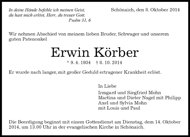 Hier finden Sie alle Traueranzeigen aus der Zeitung, die bisher für Erwin Körber erschienen sind. Weitere Traueranzeigen, die in der Zeitung erscheinen, werden hier ebenfalls aufgelistet