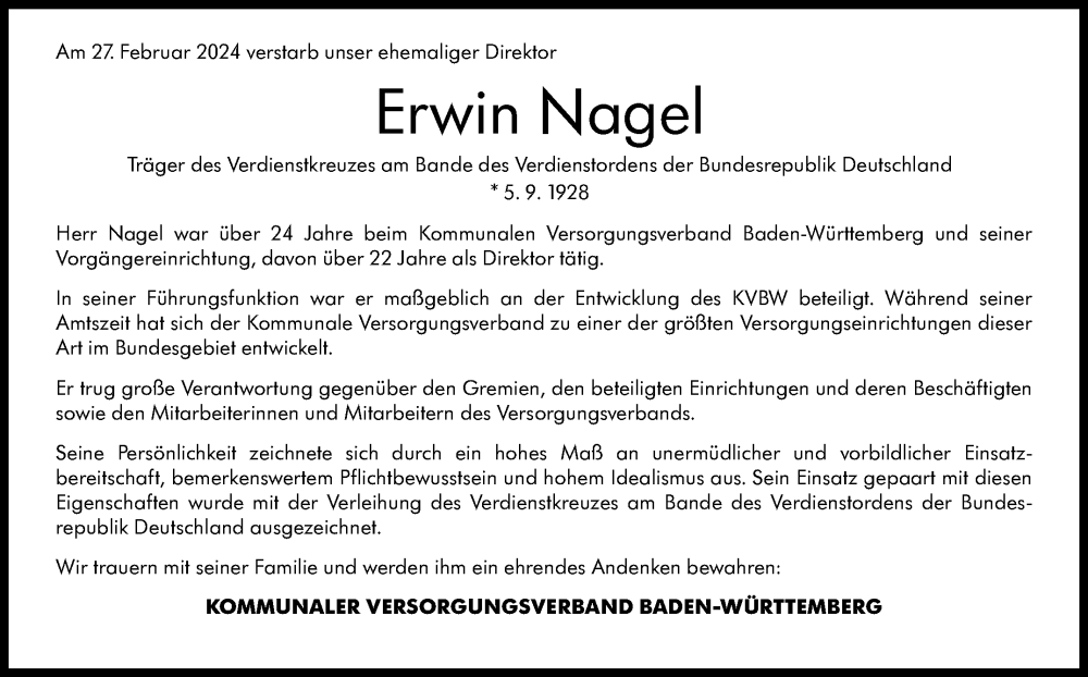 Hier finden Sie alle Traueranzeigen aus der Zeitung, die bisher für Erwin Nagel erschienen sind. Weitere Traueranzeigen, die in der Zeitung erscheinen, werden hier ebenfalls aufgelistet