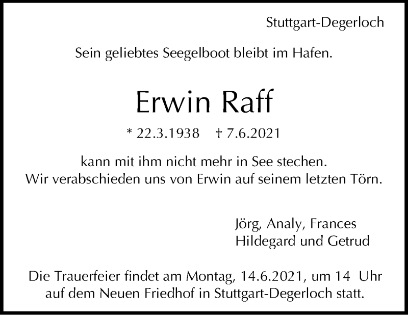 Hier finden Sie alle Traueranzeigen aus der Zeitung, die bisher für Erwin Raff erschienen sind. Weitere Traueranzeigen, die in der Zeitung erscheinen, werden hier ebenfalls aufgelistet