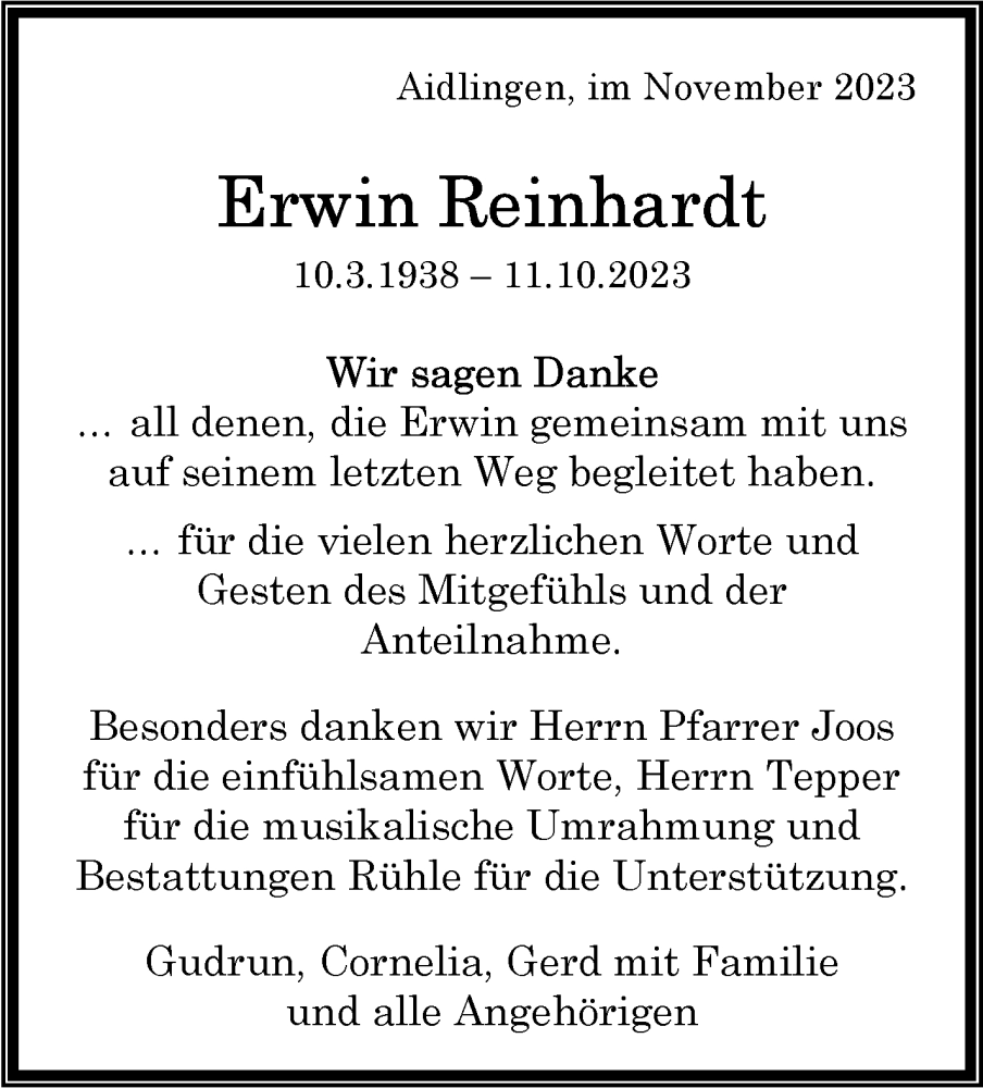 Hier finden Sie alle Traueranzeigen aus der Zeitung, die bisher für Erwin Reinhardt erschienen sind. Weitere Traueranzeigen, die in der Zeitung erscheinen, werden hier ebenfalls aufgelistet