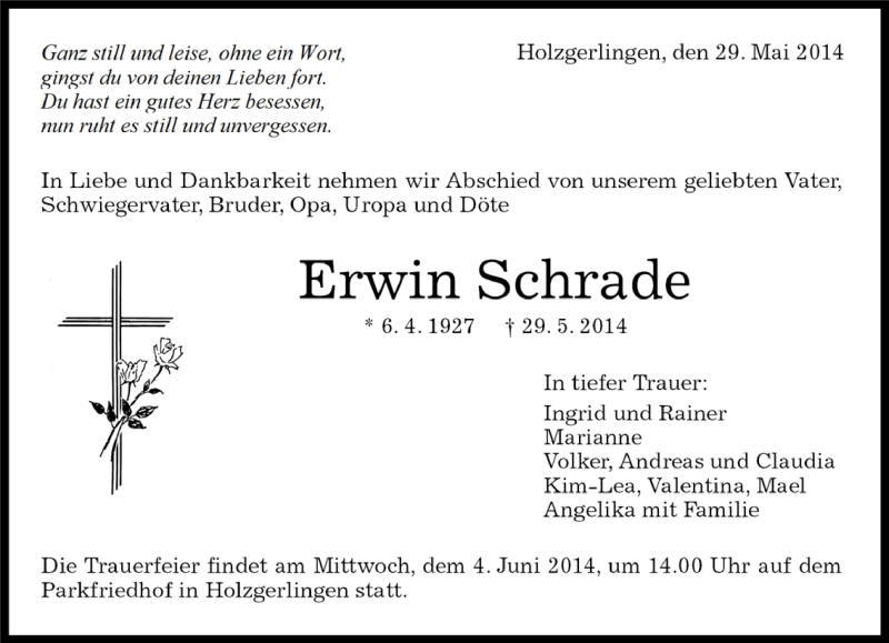 Hier finden Sie alle Traueranzeigen aus der Zeitung, die bisher für Erwin Schrade erschienen sind. Weitere Traueranzeigen, die in der Zeitung erscheinen, werden hier ebenfalls aufgelistet