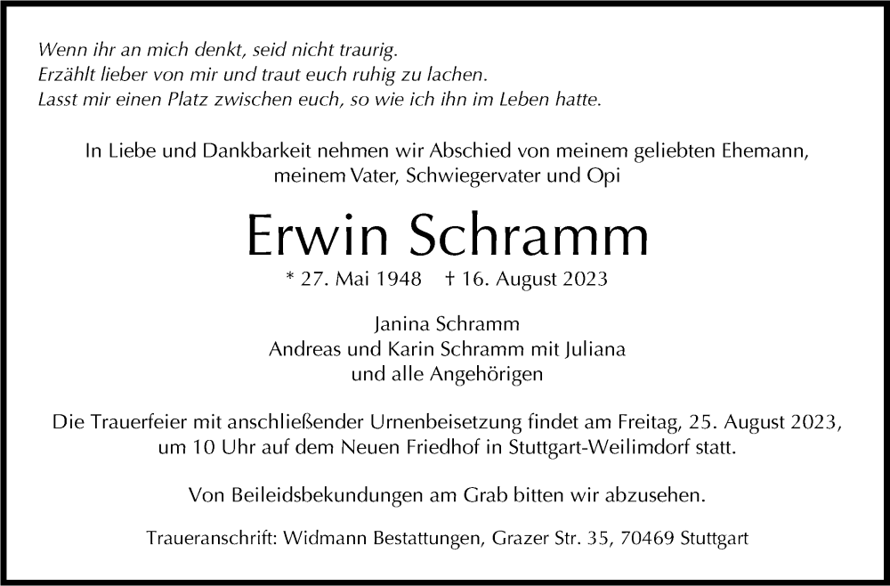 Hier finden Sie alle Traueranzeigen aus der Zeitung, die bisher für Erwin Schramm erschienen sind. Weitere Traueranzeigen, die in der Zeitung erscheinen, werden hier ebenfalls aufgelistet