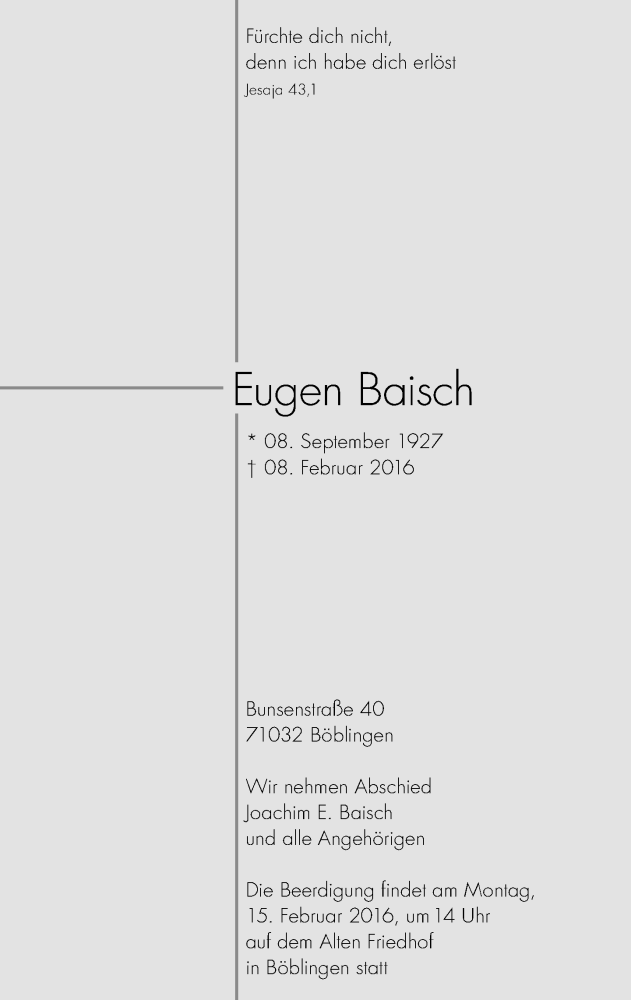 Hier finden Sie alle Traueranzeigen aus der Zeitung, die bisher für Eugen Baisch erschienen sind. Weitere Traueranzeigen, die in der Zeitung erscheinen, werden hier ebenfalls aufgelistet