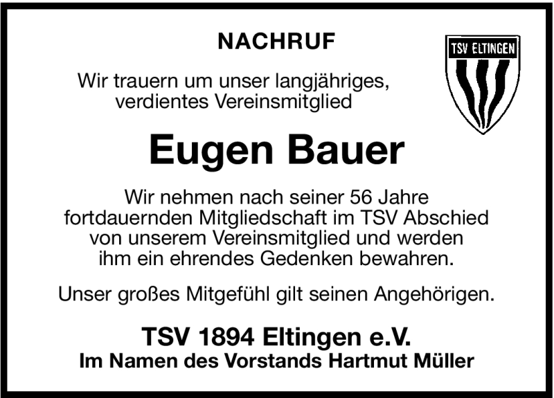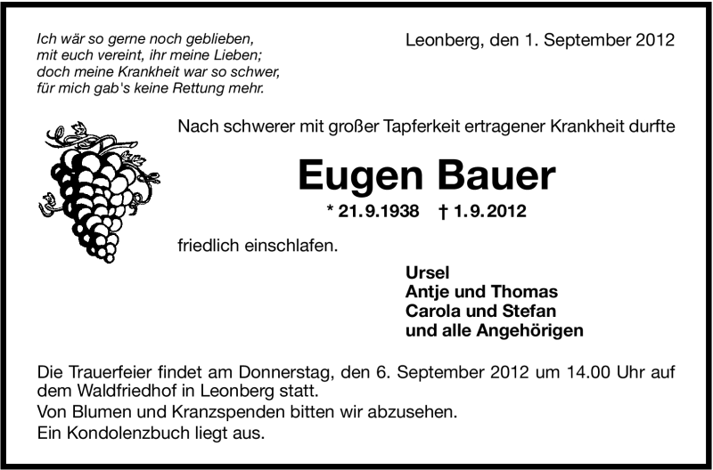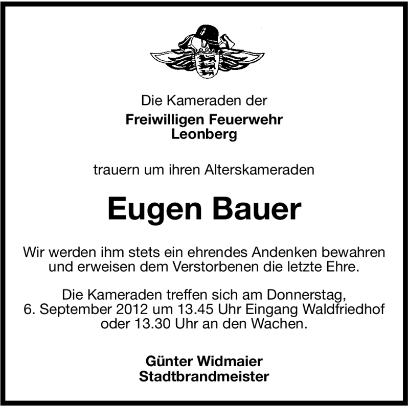 Hier finden Sie alle Traueranzeigen aus der Zeitung, die bisher für Eugen Bauer erschienen sind. Weitere Traueranzeigen, die in der Zeitung erscheinen, werden hier ebenfalls aufgelistet