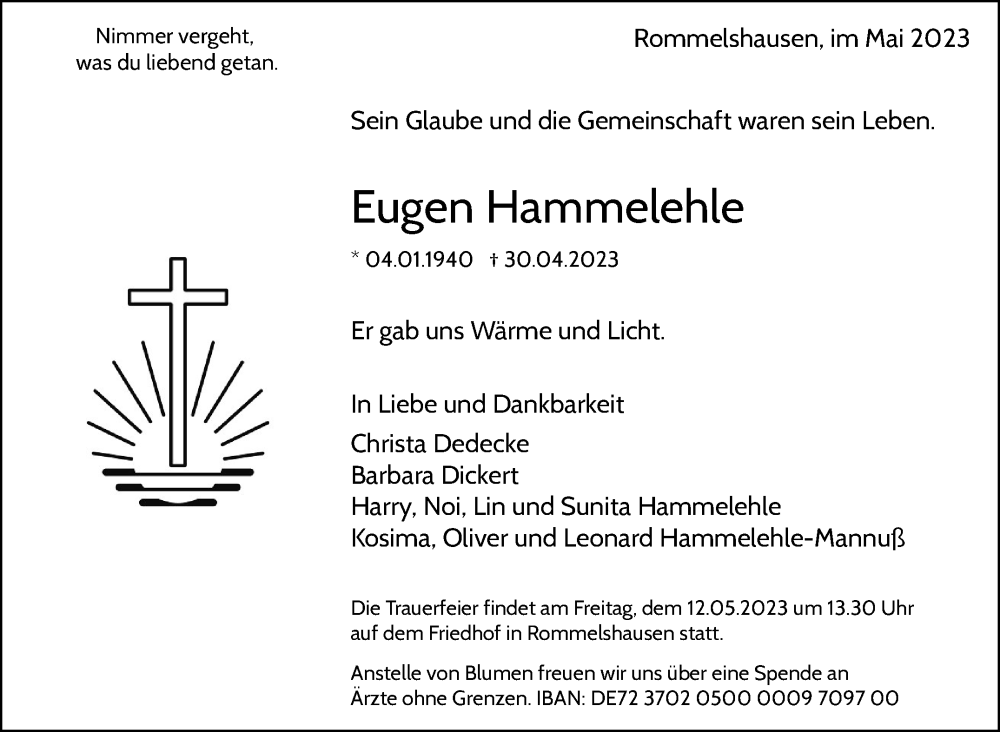 Hier finden Sie alle Traueranzeigen aus der Zeitung, die bisher für Eugen Hammelehle erschienen sind. Weitere Traueranzeigen, die in der Zeitung erscheinen, werden hier ebenfalls aufgelistet