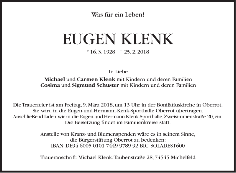Hier finden Sie alle Traueranzeigen aus der Zeitung, die bisher für Eugen Klenk erschienen sind. Weitere Traueranzeigen, die in der Zeitung erscheinen, werden hier ebenfalls aufgelistet