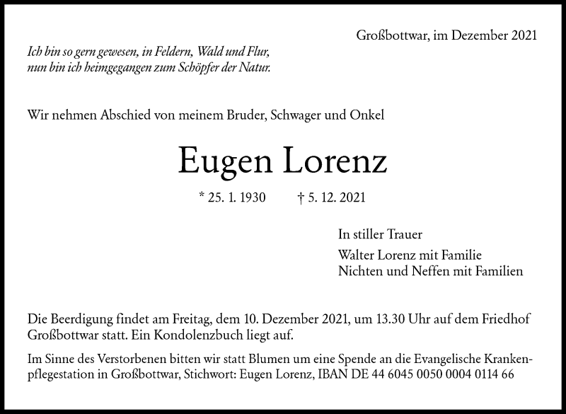 Hier finden Sie alle Traueranzeigen aus der Zeitung, die bisher für Eugen Lorenz erschienen sind. Weitere Traueranzeigen, die in der Zeitung erscheinen, werden hier ebenfalls aufgelistet