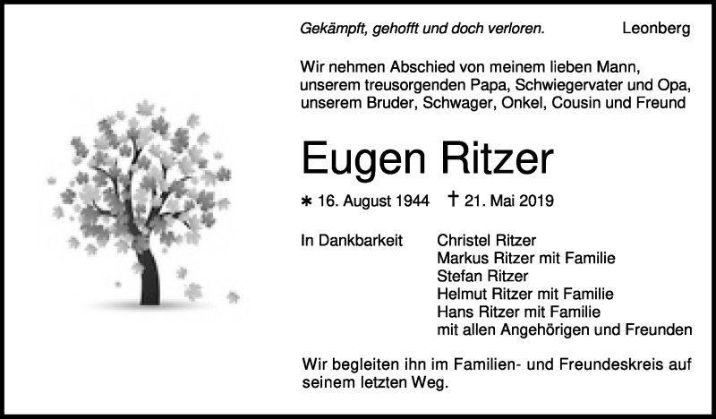 Hier finden Sie alle Traueranzeigen aus der Zeitung, die bisher für Eugen Ritzer erschienen sind. Weitere Traueranzeigen, die in der Zeitung erscheinen, werden hier ebenfalls aufgelistet