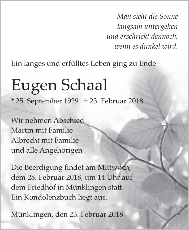 Hier finden Sie alle Traueranzeigen aus der Zeitung, die bisher für Eugen Schaal erschienen sind. Weitere Traueranzeigen, die in der Zeitung erscheinen, werden hier ebenfalls aufgelistet