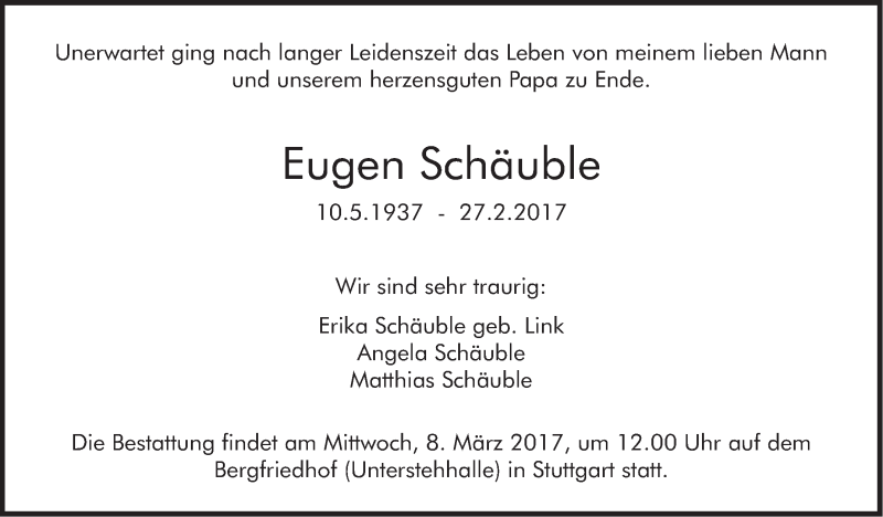 Hier finden Sie alle Traueranzeigen aus der Zeitung, die bisher für Eugen Schäuble erschienen sind. Weitere Traueranzeigen, die in der Zeitung erscheinen, werden hier ebenfalls aufgelistet