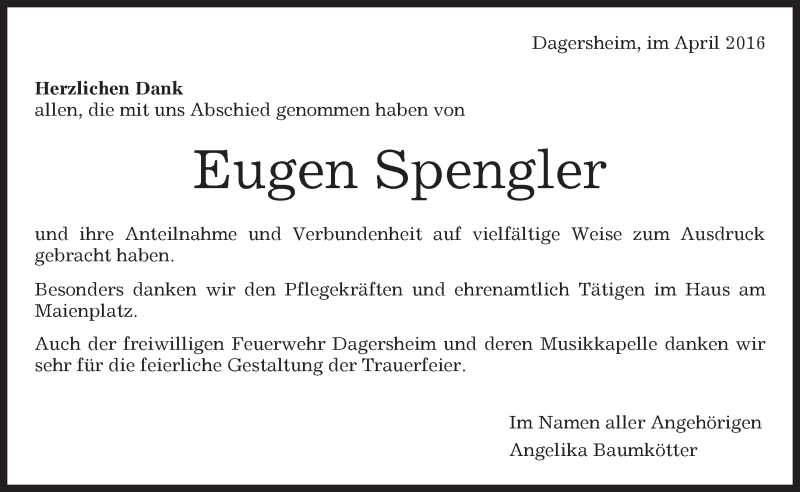 Hier finden Sie alle Traueranzeigen aus der Zeitung, die bisher für Eugen Spengler erschienen sind. Weitere Traueranzeigen, die in der Zeitung erscheinen, werden hier ebenfalls aufgelistet