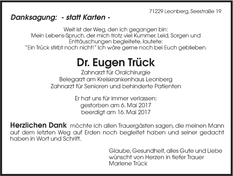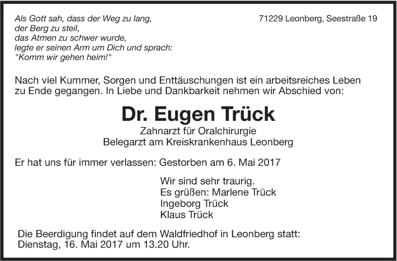 Hier finden Sie alle Traueranzeigen aus der Zeitung, die bisher für Eugen Trück erschienen sind. Weitere Traueranzeigen, die in der Zeitung erscheinen, werden hier ebenfalls aufgelistet
