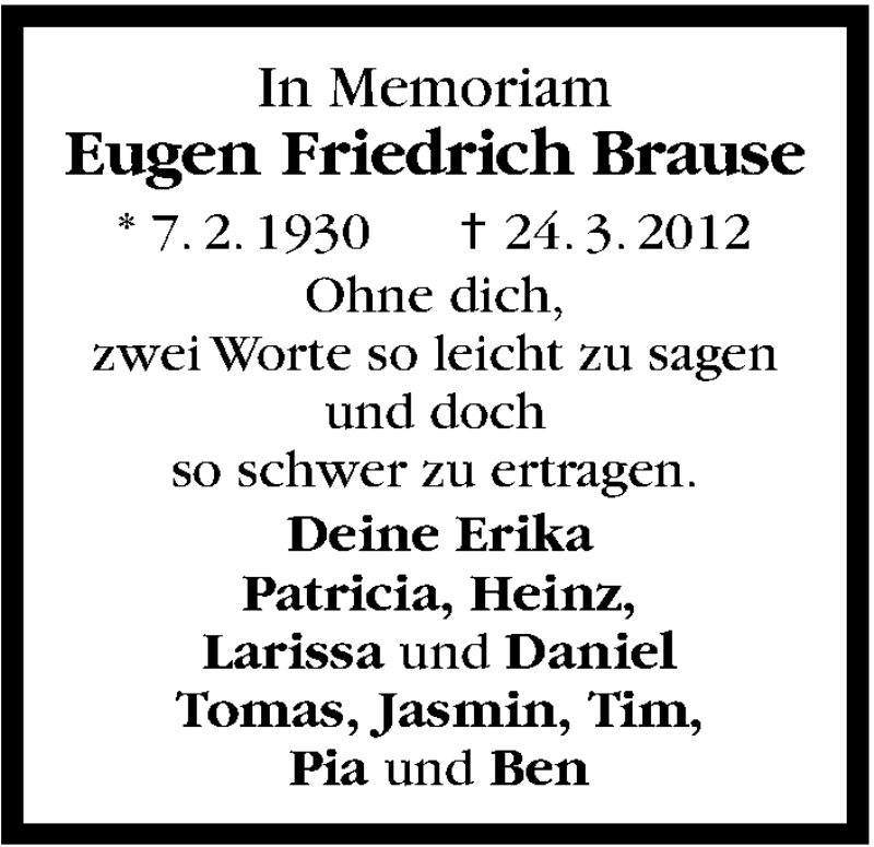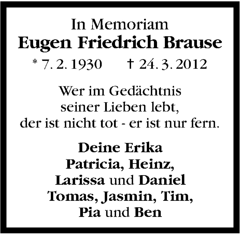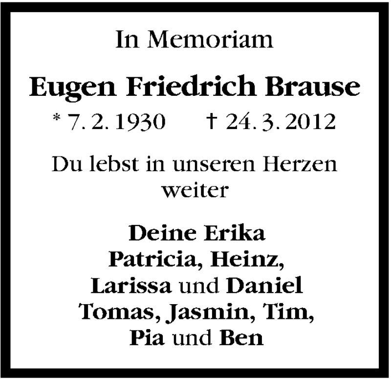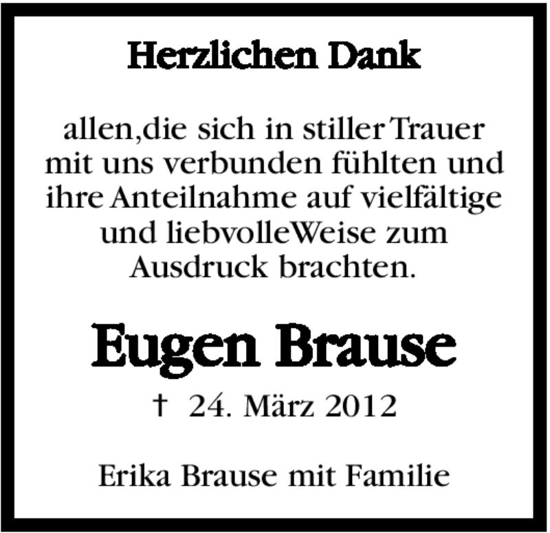 Hier finden Sie alle Traueranzeigen aus der Zeitung, die bisher für Eugen Friedrich Brause erschienen sind. Weitere Traueranzeigen, die in der Zeitung erscheinen, werden hier ebenfalls aufgelistet