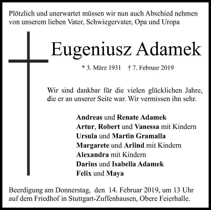 Hier finden Sie alle Traueranzeigen aus der Zeitung, die bisher für Eugeniusz Adamek erschienen sind. Weitere Traueranzeigen, die in der Zeitung erscheinen, werden hier ebenfalls aufgelistet