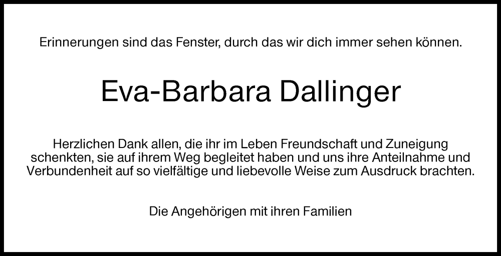 Hier finden Sie alle Traueranzeigen aus der Zeitung, die bisher für Eva-Barbara Dallinger erschienen sind. Weitere Traueranzeigen, die in der Zeitung erscheinen, werden hier ebenfalls aufgelistet
