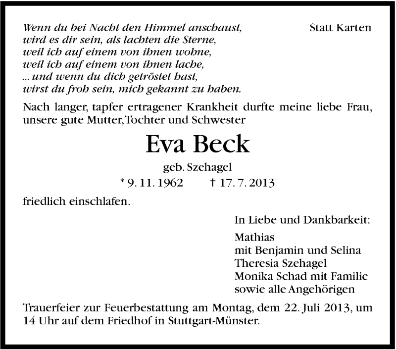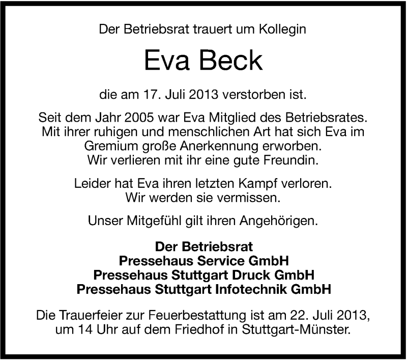 Hier finden Sie alle Traueranzeigen aus der Zeitung, die bisher für Eva Beck erschienen sind. Weitere Traueranzeigen, die in der Zeitung erscheinen, werden hier ebenfalls aufgelistet