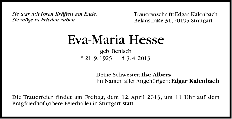 Hier finden Sie alle Traueranzeigen aus der Zeitung, die bisher für Eva-Maria Hesse erschienen sind. Weitere Traueranzeigen, die in der Zeitung erscheinen, werden hier ebenfalls aufgelistet