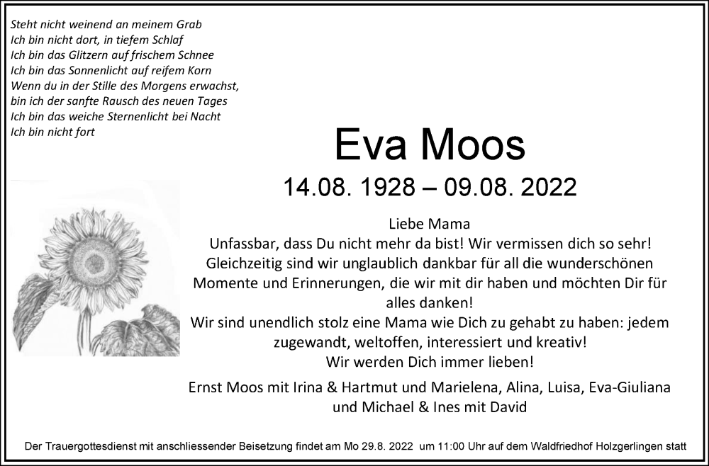 Hier finden Sie alle Traueranzeigen aus der Zeitung, die bisher für Eva Moos erschienen sind. Weitere Traueranzeigen, die in der Zeitung erscheinen, werden hier ebenfalls aufgelistet