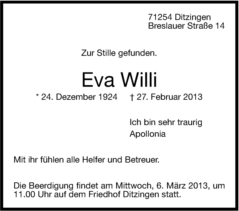 Hier finden Sie alle Traueranzeigen aus der Zeitung, die bisher für Eva Willi erschienen sind. Weitere Traueranzeigen, die in der Zeitung erscheinen, werden hier ebenfalls aufgelistet