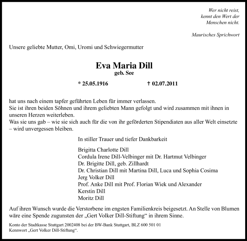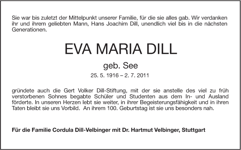 Hier finden Sie alle Traueranzeigen aus der Zeitung, die bisher für Eva Maria Dill erschienen sind. Weitere Traueranzeigen, die in der Zeitung erscheinen, werden hier ebenfalls aufgelistet