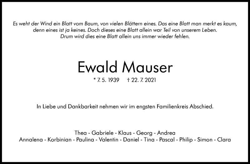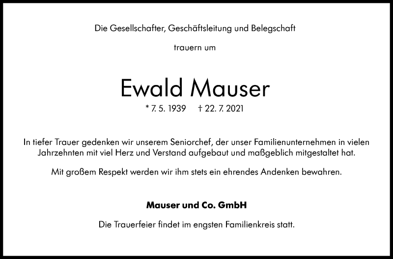 Hier finden Sie alle Traueranzeigen aus der Zeitung, die bisher für Ewald Mauser erschienen sind. Weitere Traueranzeigen, die in der Zeitung erscheinen, werden hier ebenfalls aufgelistet