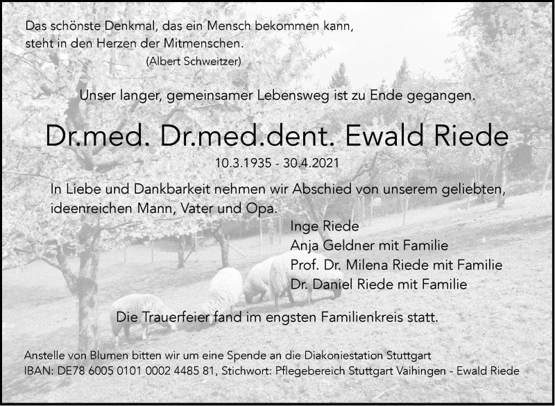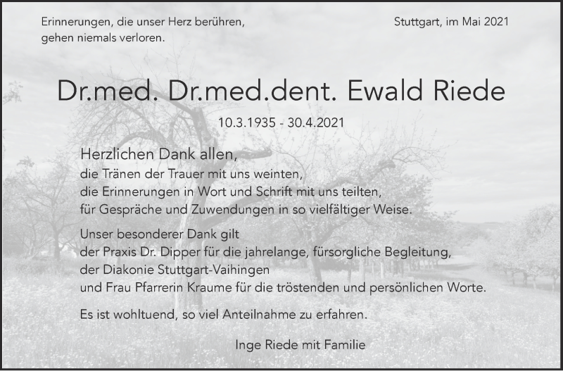 Hier finden Sie alle Traueranzeigen aus der Zeitung, die bisher für Ewald Riede erschienen sind. Weitere Traueranzeigen, die in der Zeitung erscheinen, werden hier ebenfalls aufgelistet