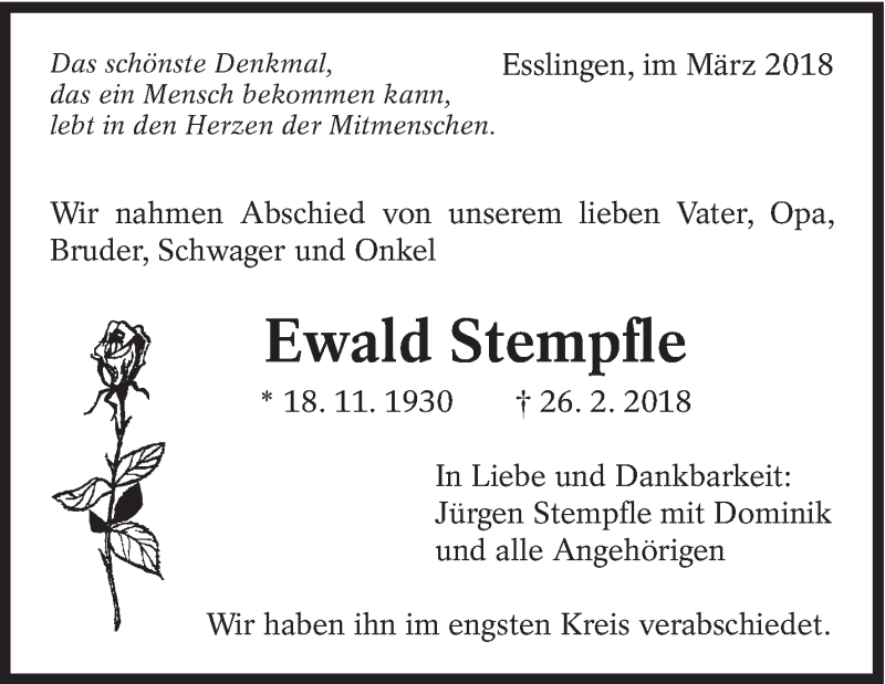 Hier finden Sie alle Traueranzeigen aus der Zeitung, die bisher für Ewald Stempfle erschienen sind. Weitere Traueranzeigen, die in der Zeitung erscheinen, werden hier ebenfalls aufgelistet