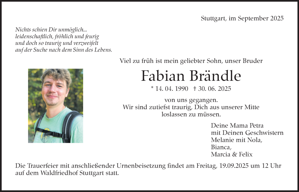 Hier finden Sie alle Traueranzeigen aus der Zeitung, die bisher für Fabian Brändle erschienen sind. Weitere Traueranzeigen, die in der Zeitung erscheinen, werden hier ebenfalls aufgelistet